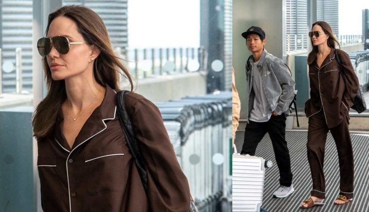 Jolie was accompanied by her 18-year-old son, Pax Thien Jolie-Pitt, she headed to their flight wearing a brown pyjama set and her sandals in a caramel shade from Valentino’s Garavani were equally giving comfy and elegant vibes. She also paired oversized aviator sunglasses and a snug black quilted tote bag.